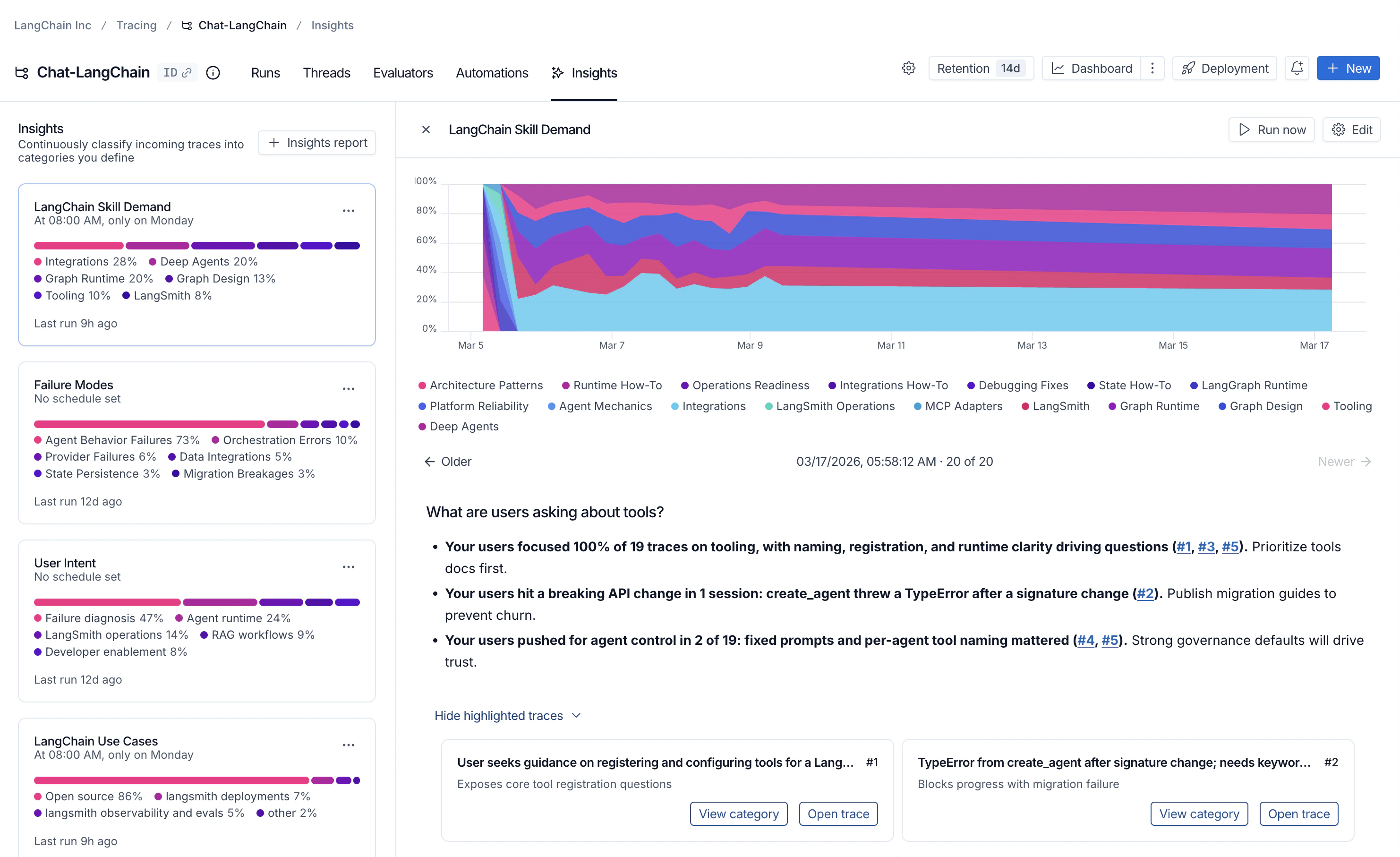 点击任何类别会显示其细分为子类别,这使您能更细致地理解该类追踪数据中的交互模式。 在 Chat Langchain 示例中,数据与检索 下有如 向量存储 和 数据摄取 这样的子类别。单个追踪数据