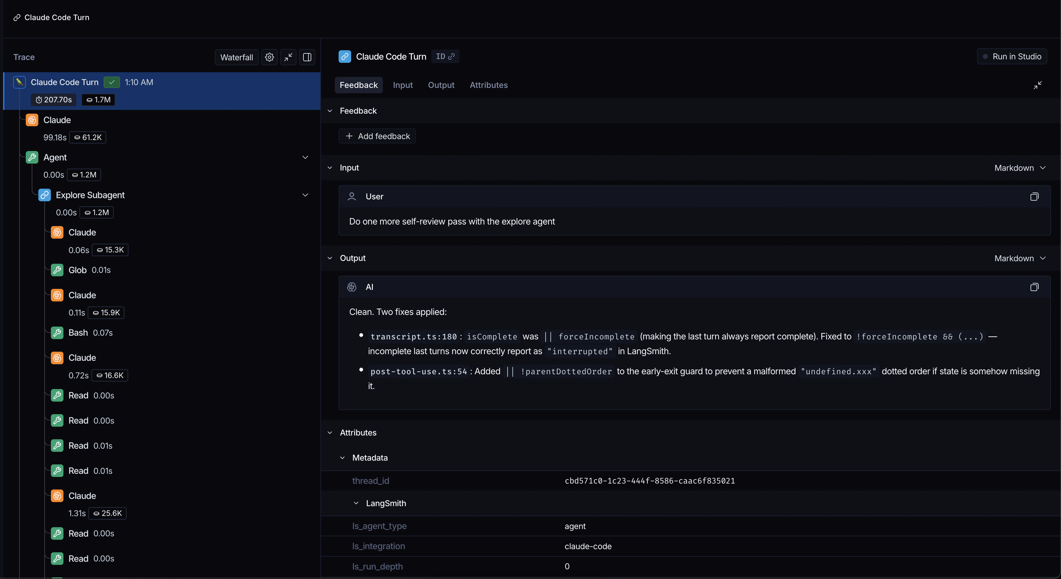 追踪记录将在 Claude Code 响应后完整地出现在 LangSmith 中。请注意,如果您在运行过程中中断,插件只会在您发送下一条消息或结束会话时刷新该次运行。 在 LangSmith 中,您将看到:- 发送给 Claude Code 的每条消息都显示为一条追踪记录。